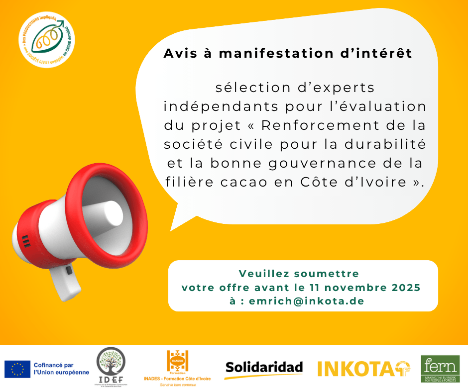 sélection d’experts indépendants pour l’évaluation du projet « Renforcement de la société civile pour la durabilité et la bonne gouvernance de la filière cacao en Côte d’Ivoire ».